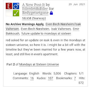 👩🎨 I’m mostly inspired by SKAM, their characters, and the city of Oslo. The actual stories are prompted by other people in the fandom, and sometimes the comments I receive on a work-in-progress shape how I write the story. I’m not sure if it’s inspiration or just motivation, but I write to record the fantasy world that I keep running through my mind, as well as to create additional content for other SKAM fans. I like to keep Isak and Even alive, and hopefully introduce them to new fans even though the show is over.